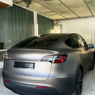 Ergebnis: Das Fahrzeug wurde vollständig in einem edlen Mattgrau foliert. Durch präzise Vorarbeit, saubere Kantenführung und sorgfältige Oberflächenverarbeitung fügt sich die Folie perfekt an die Karosserie an. Die neue Optik verleiht dem Tesla eine deutlich sportlichere und zugleich minimalistische Erscheinung. Zusätzlich schützt die Folierung den Originallack vor Steinschlägen und äußeren Einflüssen.
